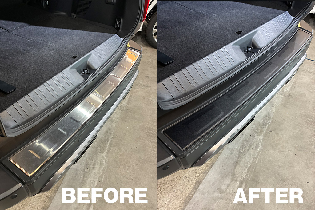 リアバンパーの天面に貼る、モデリスタさんの「リアバンパーステップガード」。これをベースにカスタムしました。